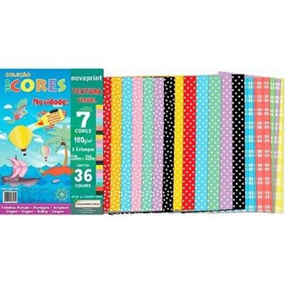 O Bloco Textura Visual Eco Cores Novaprint são papéis coloridos e com estampas ideal para Trabalhos escolares, Trabalhos artísticos, Montagens, Scapbook, Origami, Kirigami, Quilling, Colagem e diversos outros usos. Contém 36 folhas e 7 cores, sendo 3 estampas (Bolinhas, Xadrez e Coração) para cada cor. Papel: 180 g/m²